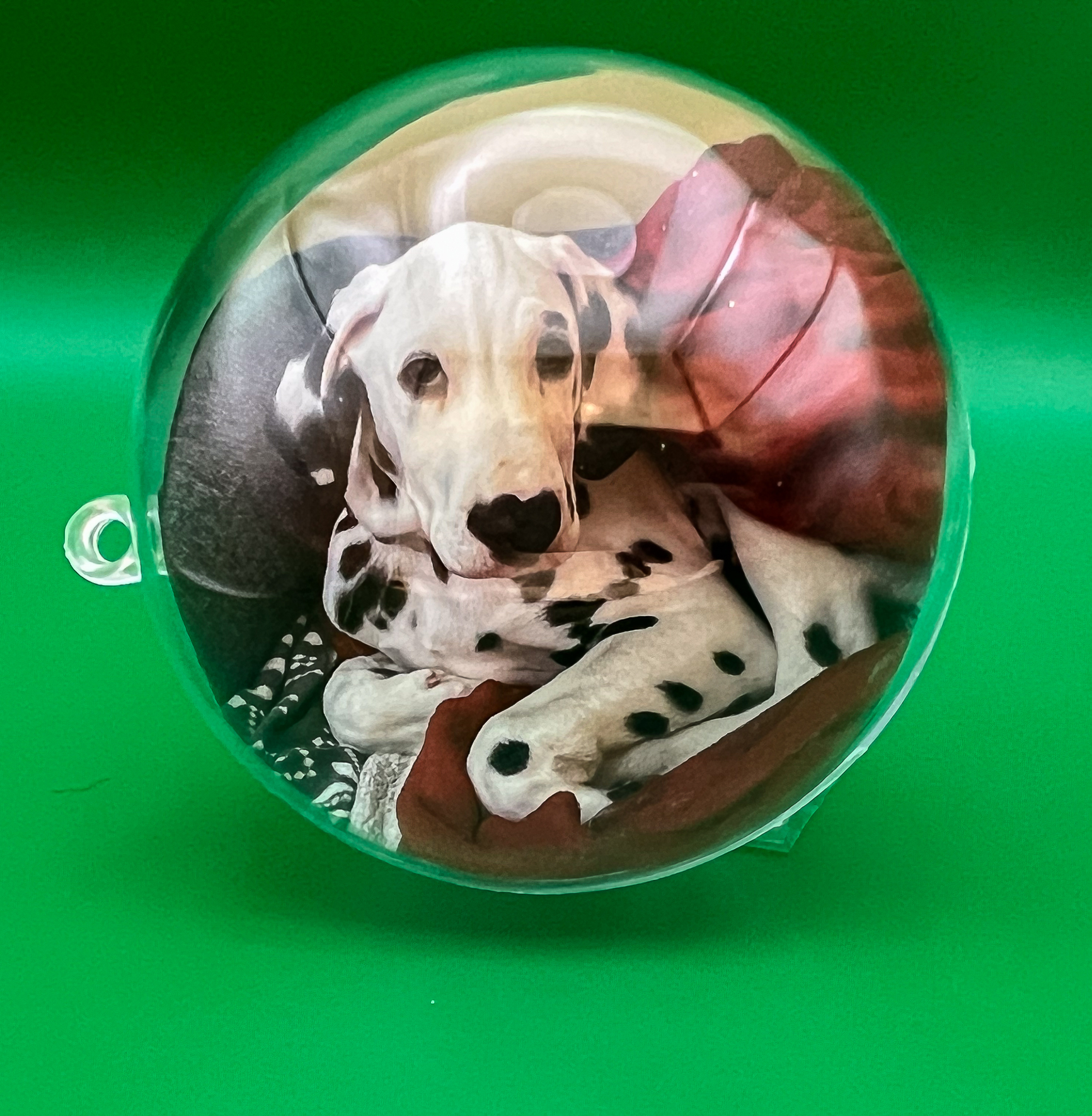 7 cm läbimõõduga plastikust kera, mille sees on 2 fotot tellija failist. Fotod on hiljem vahetetavad.