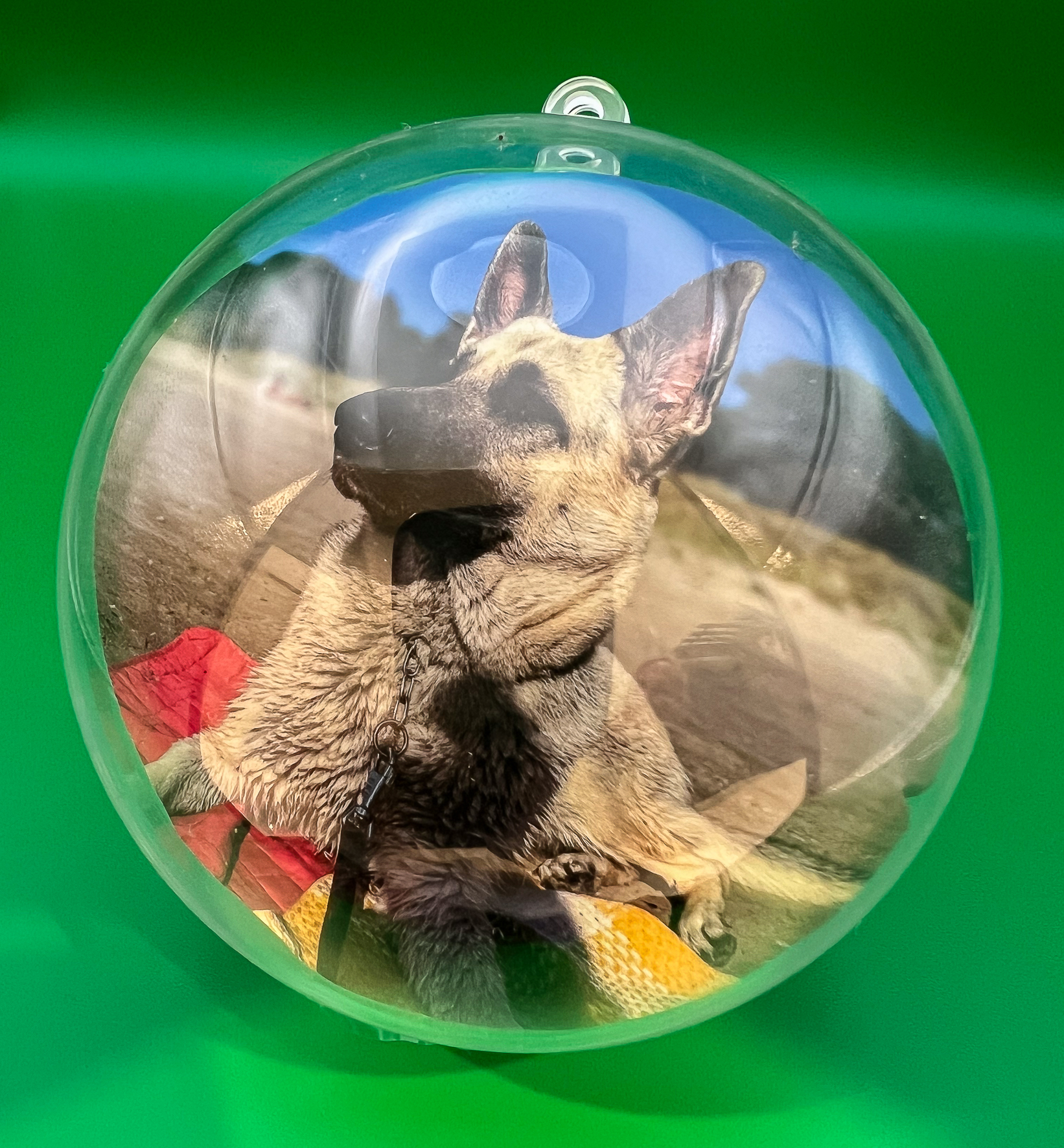 Jõuluehe, mille sees,läbipaistvas kuplis, 2 fotot tellija valikul. Kuuli läbimõõt 9 cm.